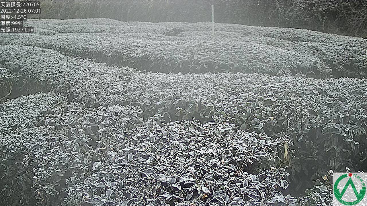 寒流來襲,武陵農場26日清晨出現-4℃的低溫,茶園覆上了一層薄薄的冰霜,宛如冰雪世界,儘管茶樹本身有相當程度的抗低溫特性,然發生結霜或結凍現象易導致凍霜害的問題!