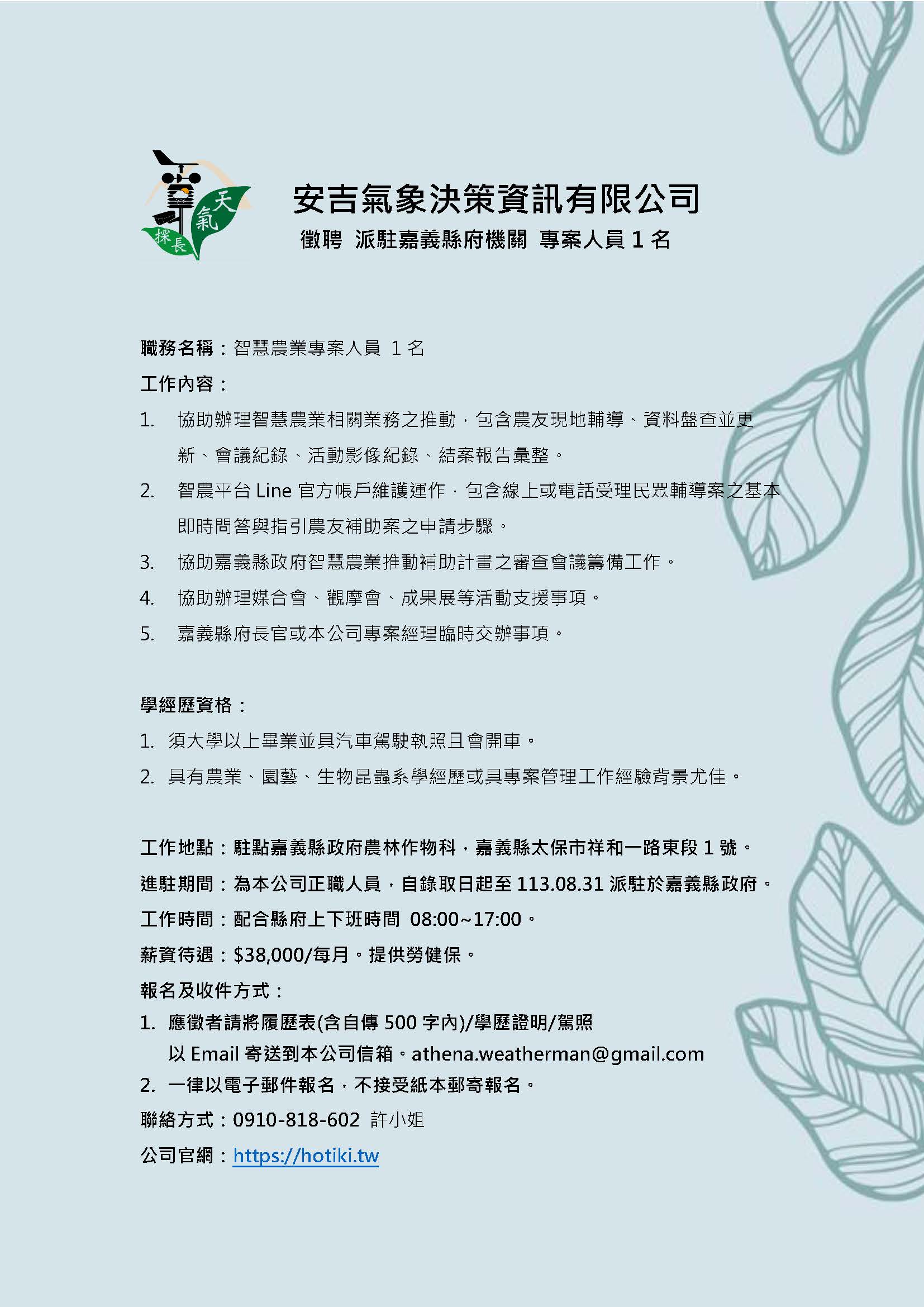 (具有農業、園藝、生物昆蟲系學經歷或具專案管理工作經驗背景尤佳)